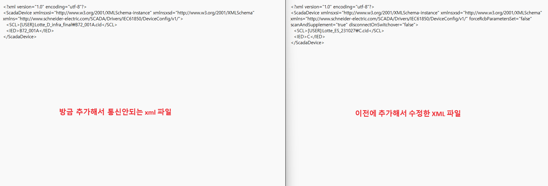 여기서 방금 추가했던 계전기 CID XML 파일 내부를 수정해야 정상적으로 통신이 됩니다.