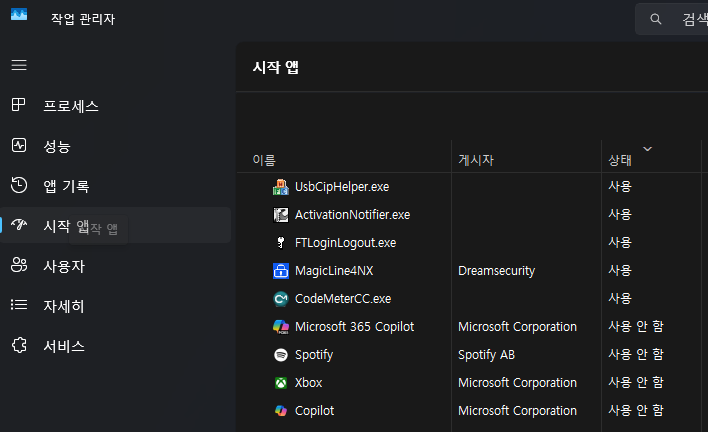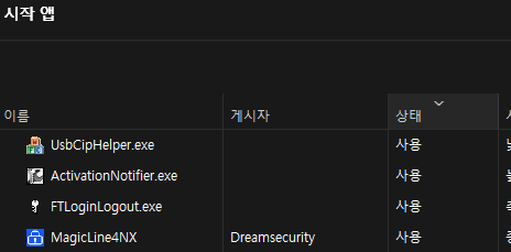 💡 팁: '상태'가 '사용'으로 되어 있는 항목은 부팅 시 자동 실행되고 있는 프로그램입니다.